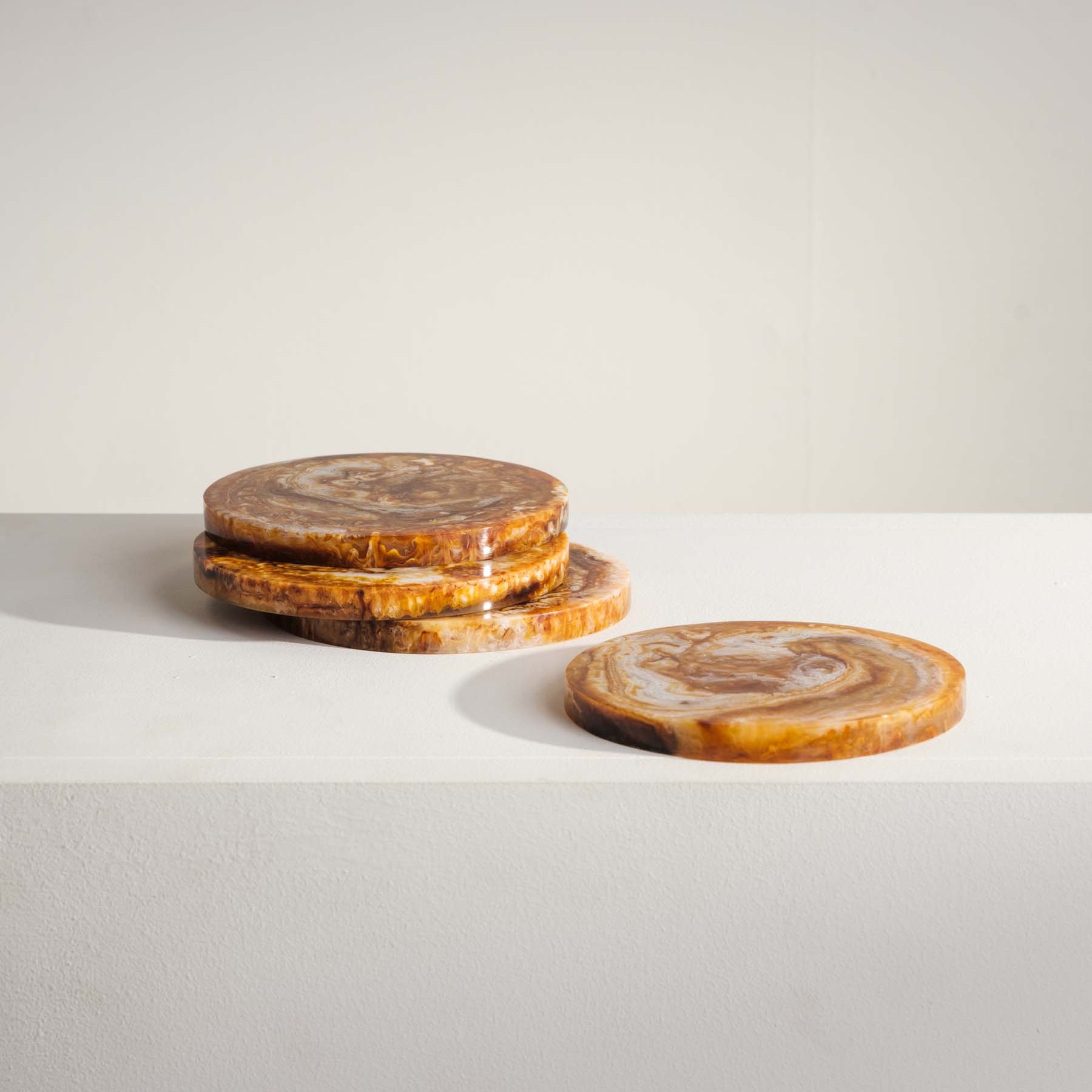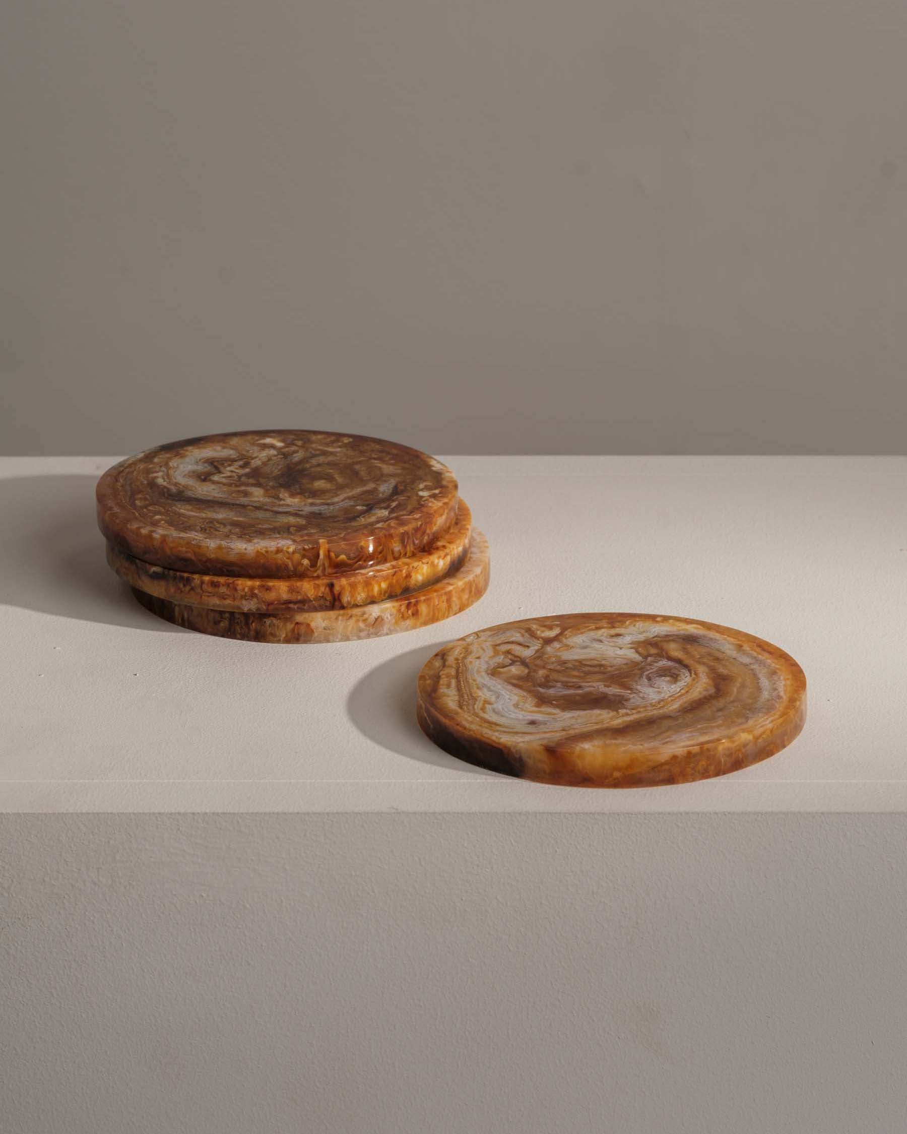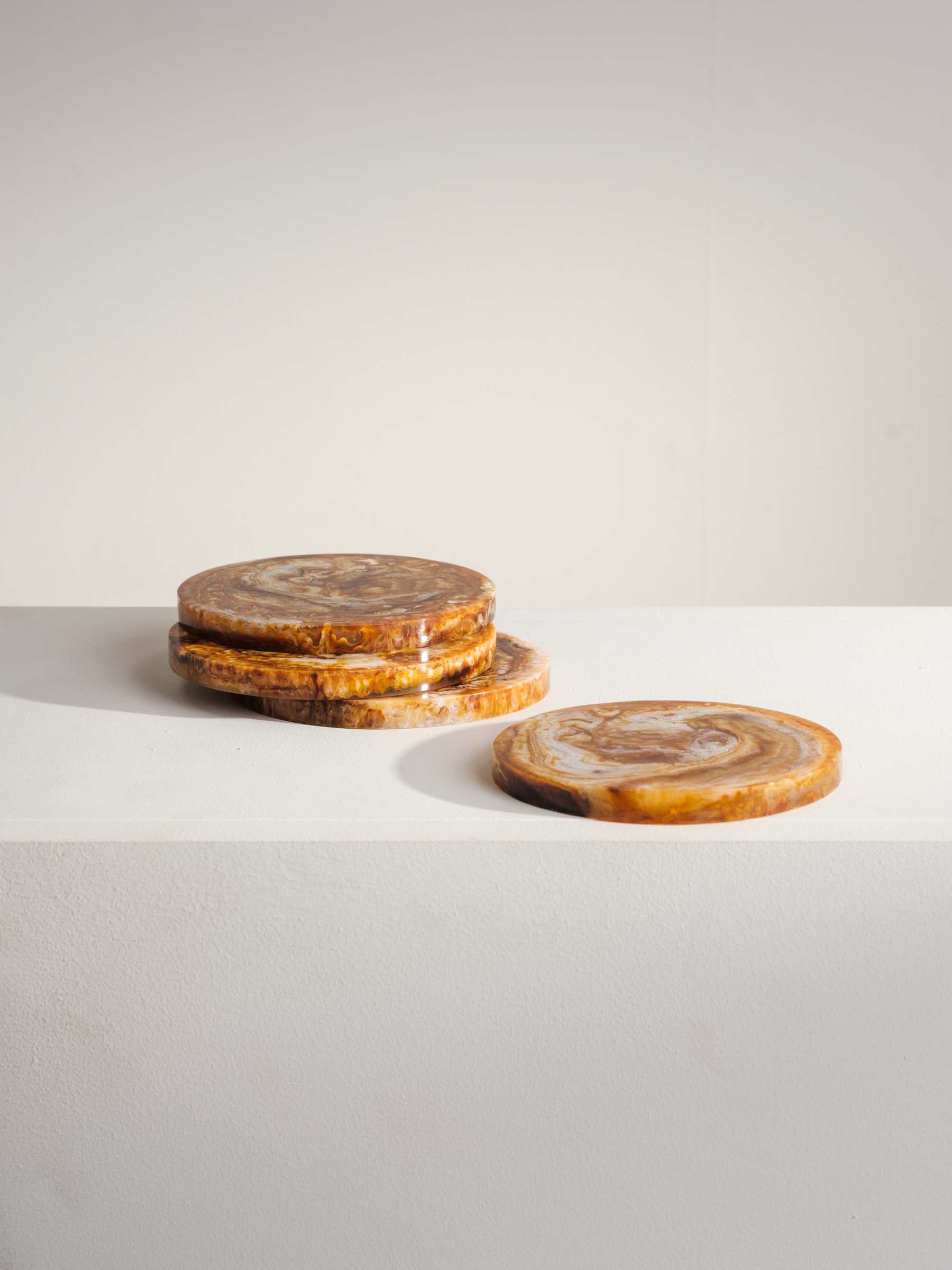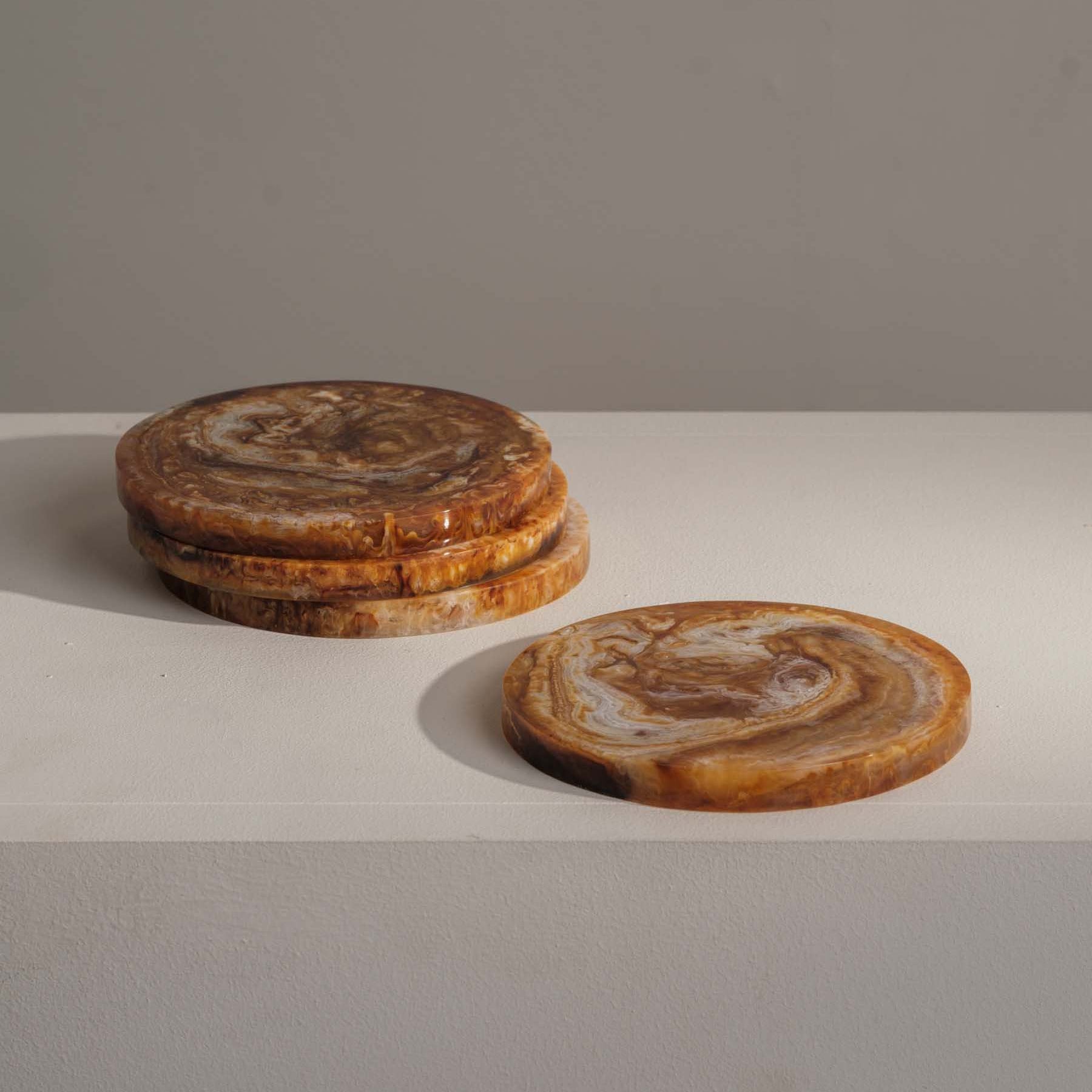 Bring natural warmth to your space with this set of four amber coasters. Blending soft neutral resin tones with rich amber for a unique and earthy look.