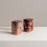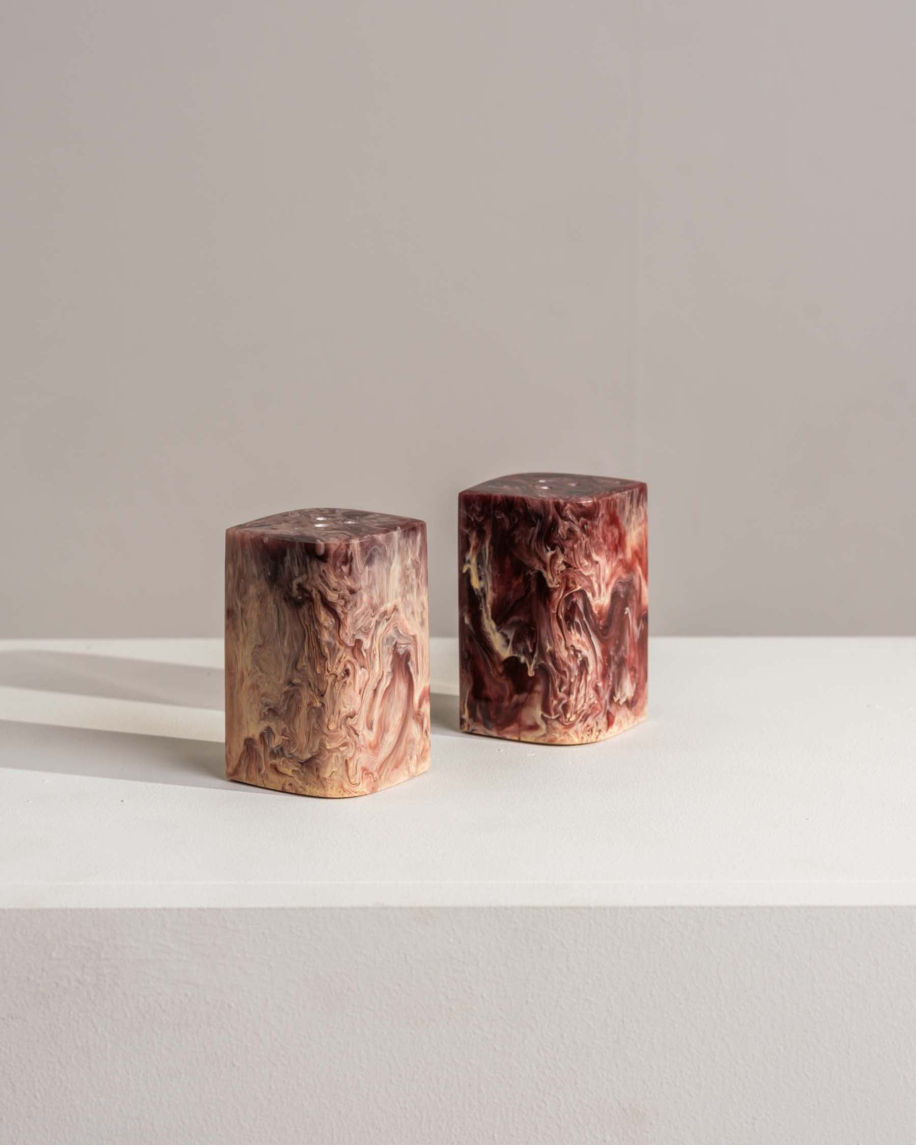 Add a touch of elegance to your table with the Elianna set of burgundy salt and pepper cellars. Each cellar features soft blush resin tones, making every piece unique.