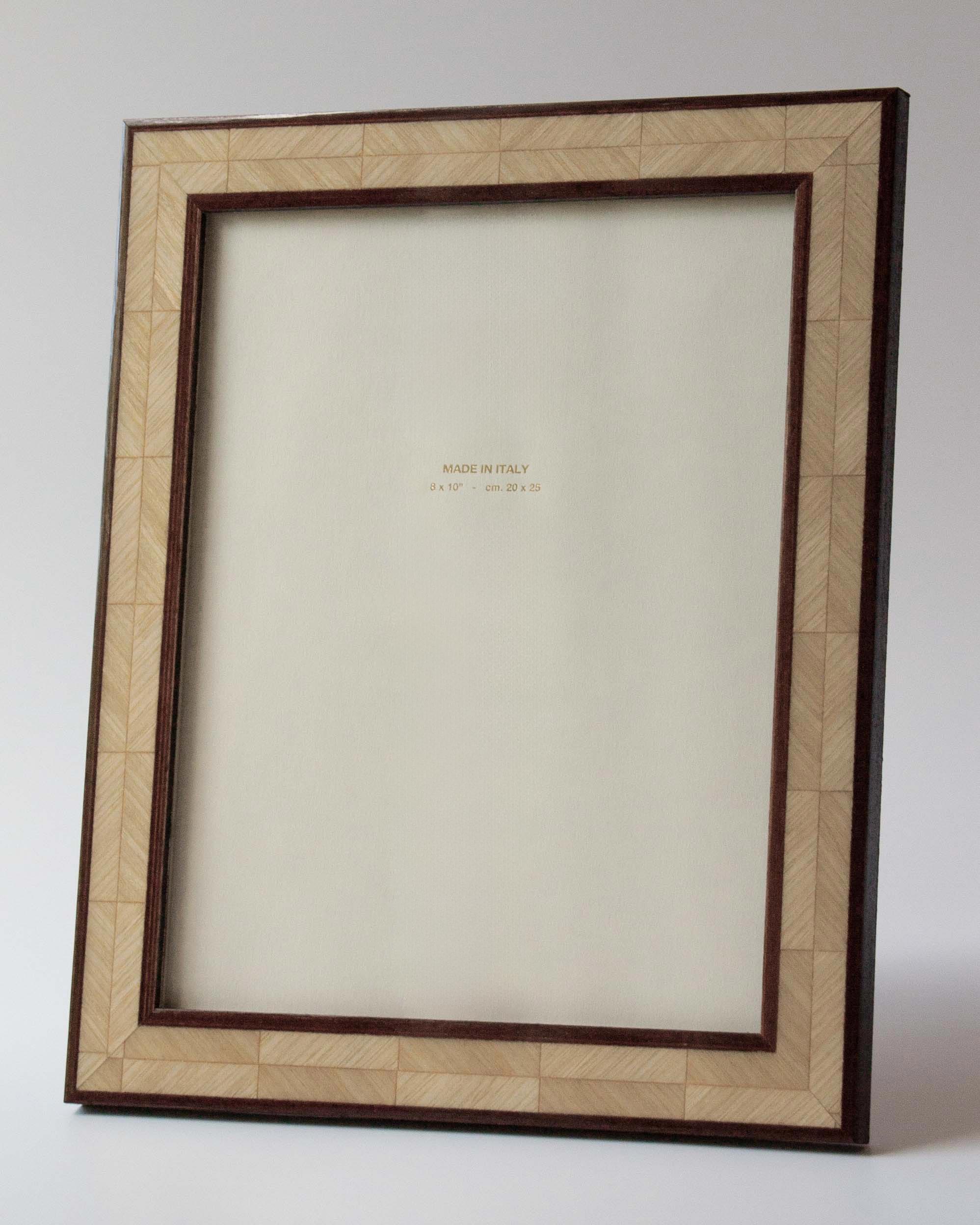 With its beautiful lacquered finish and dual tone oak herringbone marquetry, the Luciana photo frame is handmade for Anboise in Italy.