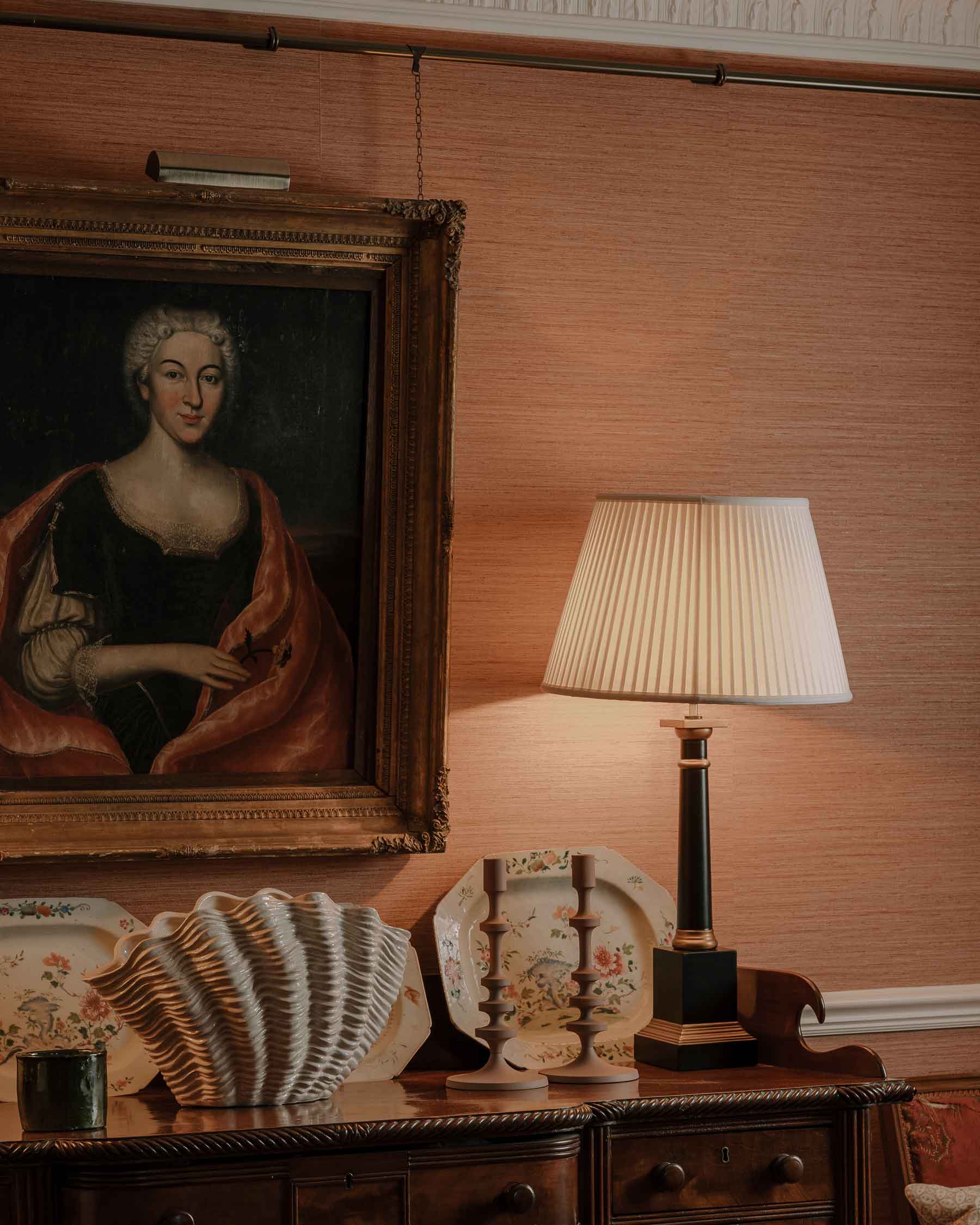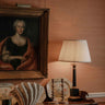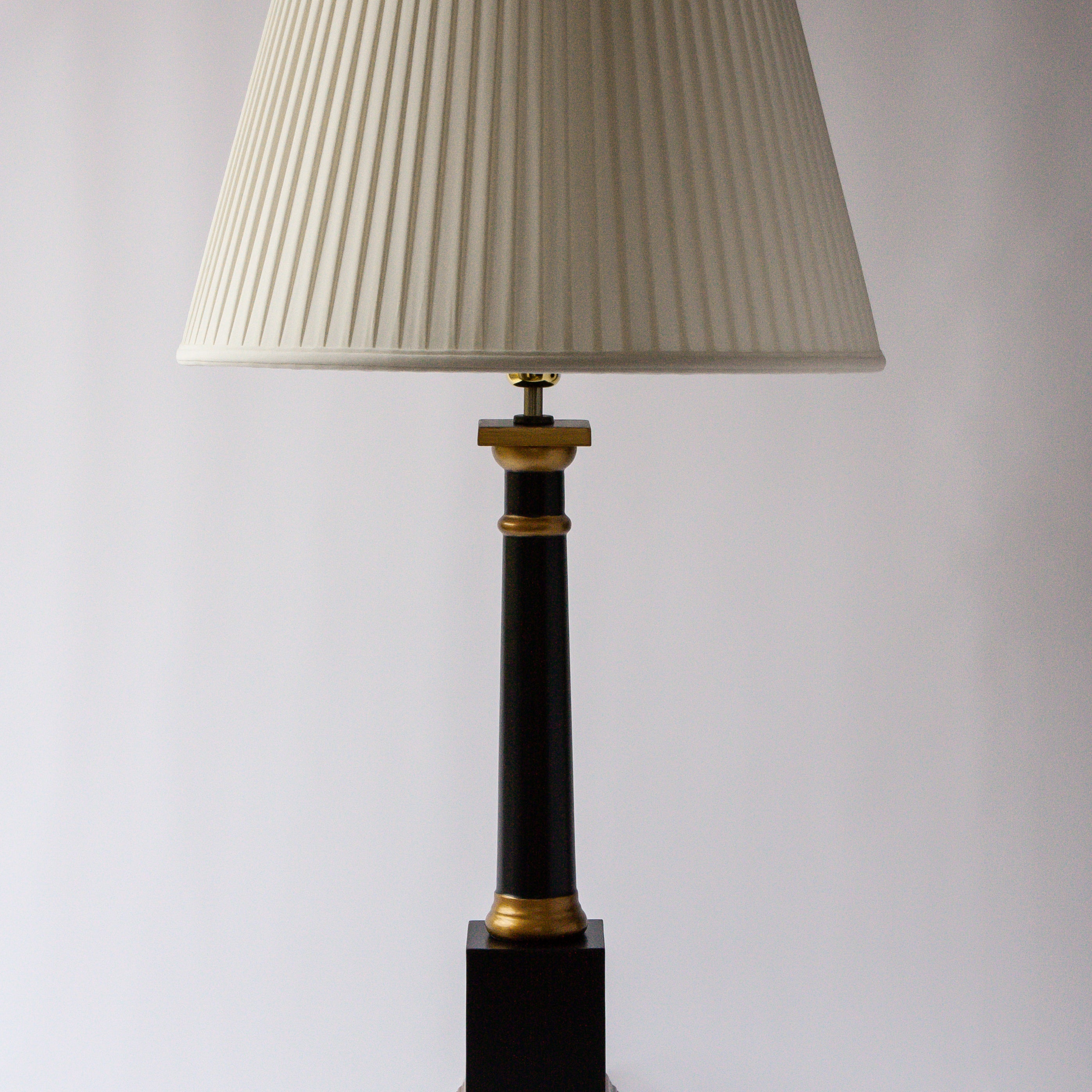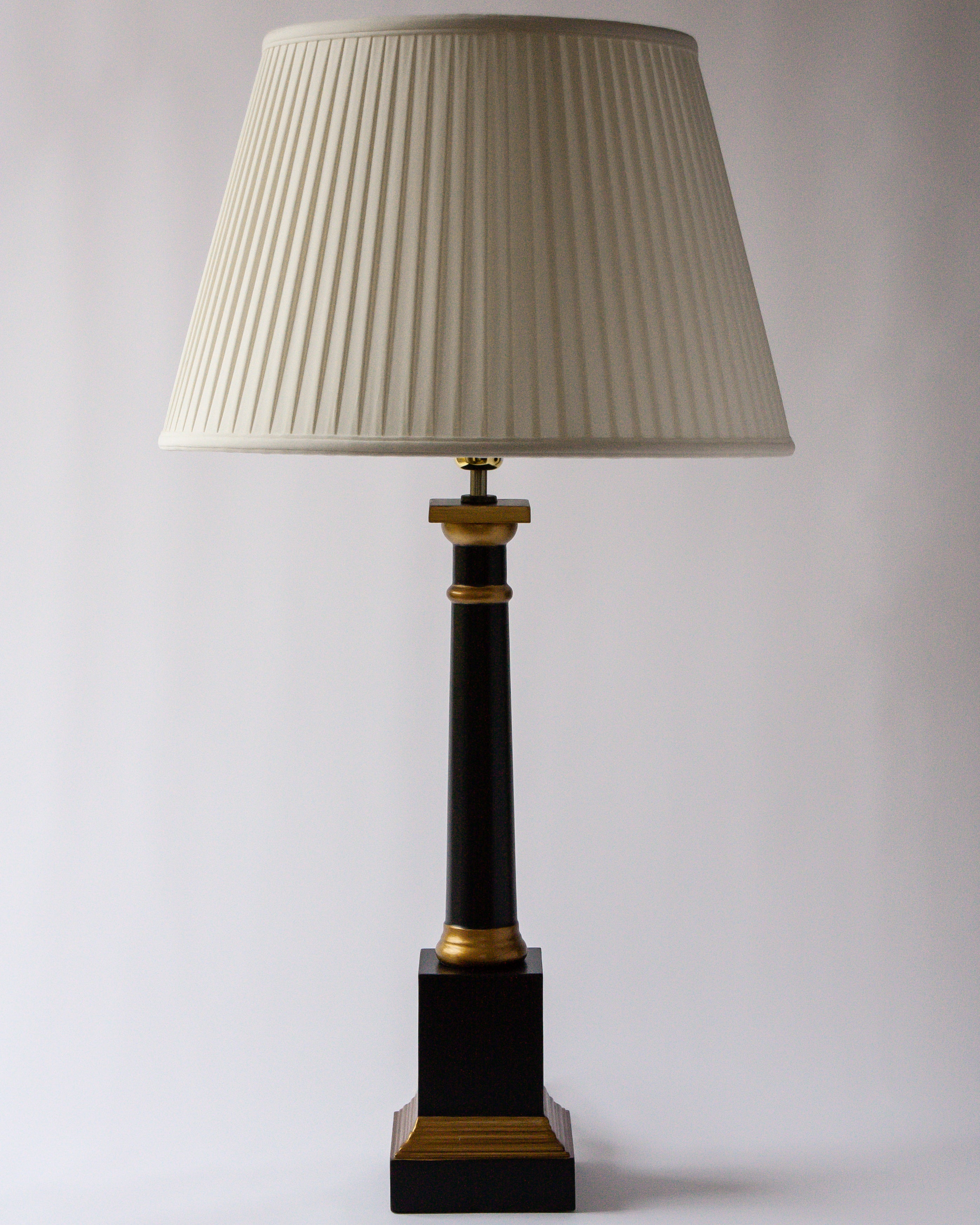 The Penelope table lamp has a classical column shaped base, is carved out of wood and finished in black with gold accents. It comes complete with a beautiful pencil pleat Ivory shade. Will sit elegantly on a sideboard or table.